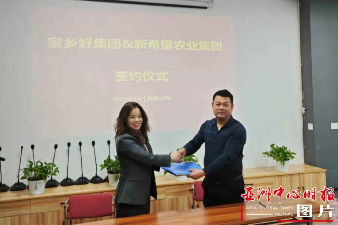 新疆家鄉(xiāng)好商貿(mào)(集團(tuán))有限公司生鮮負(fù)責(zé)人(左)與昭蘇縣新希望農(nóng)業(yè)發(fā)展投資集團(tuán)有限公司負(fù)責(zé)人(右)